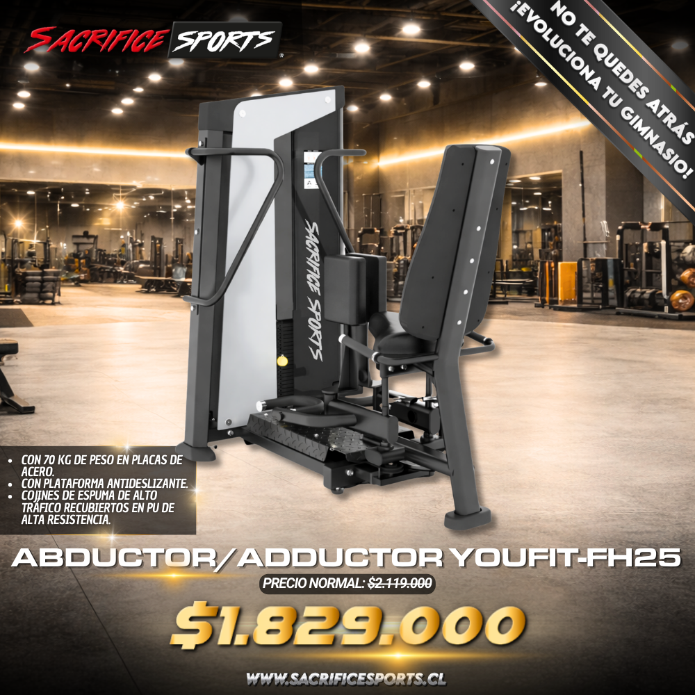 La Abductor/Adductor Youfit-FH25 permite entrenar abductores y aductores de forma eficiente en una misma máquina, optimizando espacio y garantizando un trabajo completo de la cadera y muslos. Con sus 70 kg en placas de acero, ofrece resistencia progresiva para adaptarse a usuarios de todos los niveles.