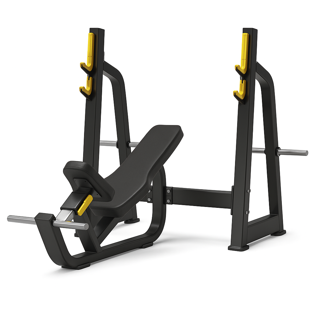 Con un diseño ergonómico que optimiza el ángulo de inclinación, su asiento ajustable y soportes para pies, asegura una activación precisa de la parte superior del pecho, mientras su estructura sólida y segura soporta los entrenamientos más exigentes. Consta también de 2 soportes de discos olímpicos a cada lado, al igual que 2 posa barras olimpicas.